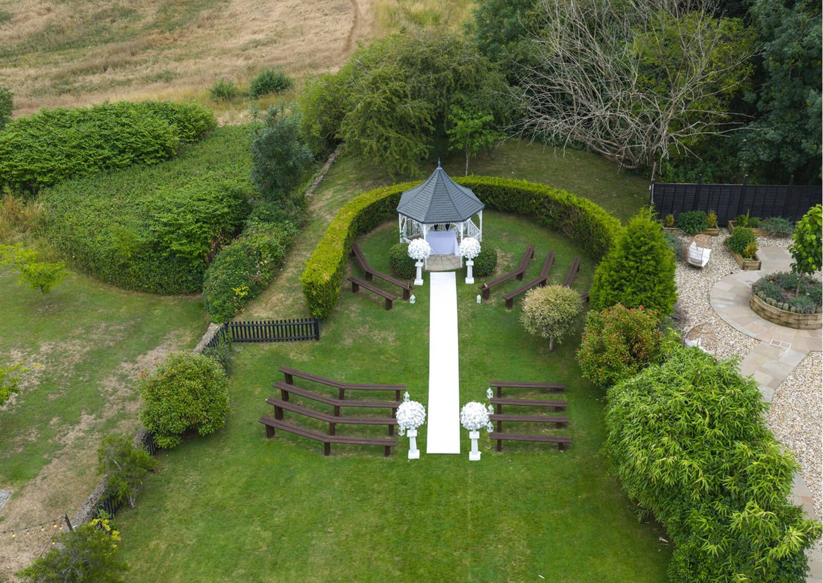When it comes to styling the Gazebo, our couples have complete freedom to personalise it however they wish. This could include adding beautiful flower arrangements to the gazebo itself and the moongate entrance. A white aisle carpet leading from the benches to the Gazebo adds an elegant touch to your entrance, while flowers and lanterns lining the aisle help create the perfect, romantic setting for your ceremony.
