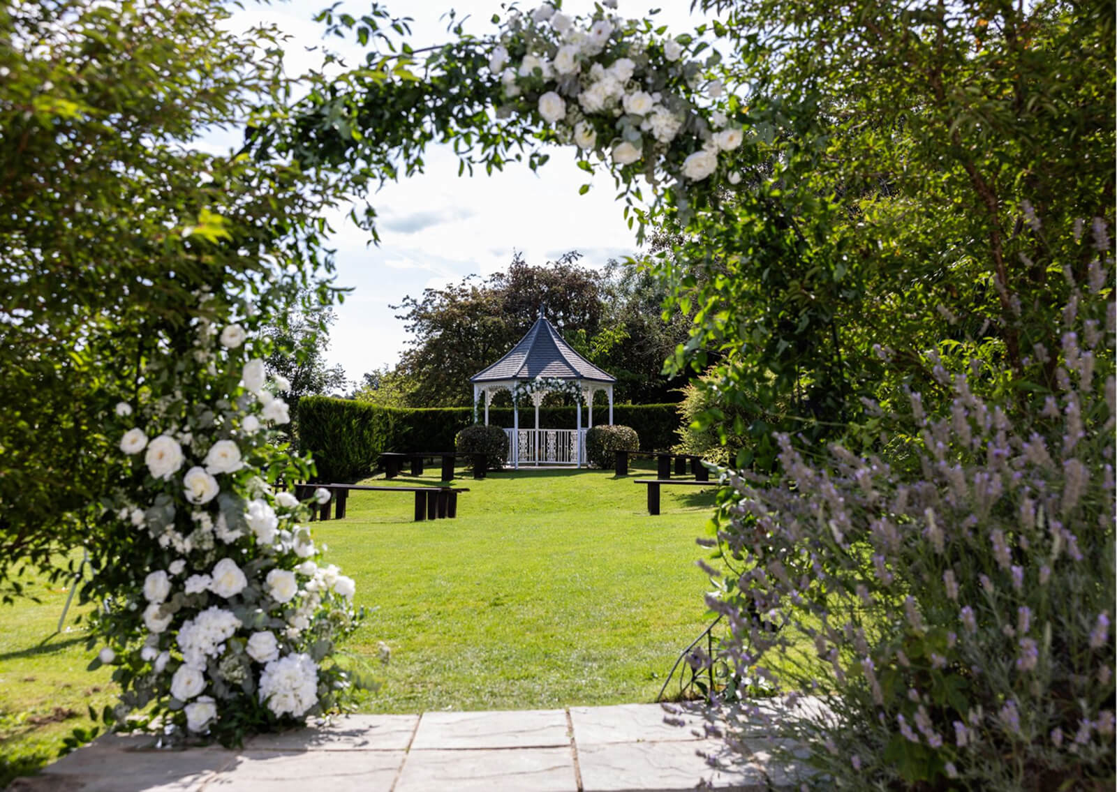 The Garden Gazebo sits just beside the Oak Lodge and is the closest ceremony spot to your getting-ready room, making it a perfect choice for a relaxed summer wedding. Don’t worry about your dress being revealed beforehand – no guests can see into the Oak Lodge garden area. So you will get that moment when you reach the moongate and everyone sees you at the same time.